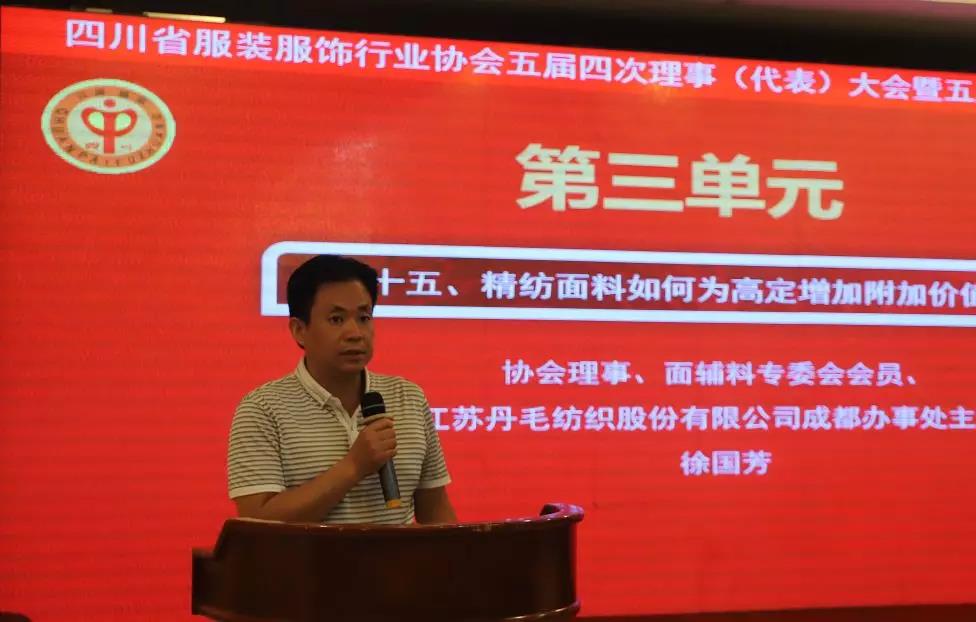 江蘇丹毛紡織股份有限公司成都辦事處主任徐國方針對精紡面料作了《精紡面料如何為高定增加附加值》主題演講。
